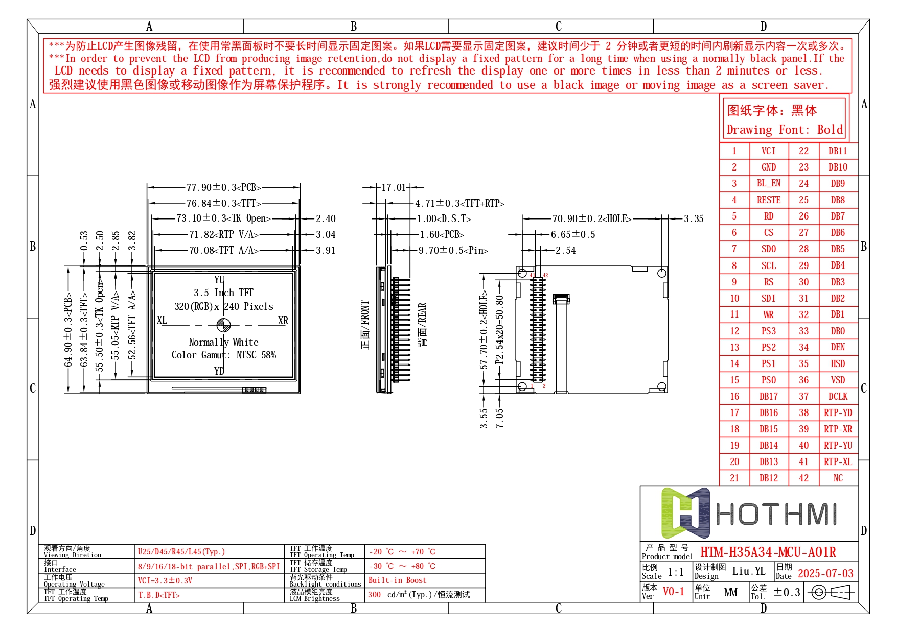 在工业智能化浪潮中,HTM-H35A34-MCU-A01R液晶模组以卓越性能重新定义3.5英寸显示解决方案。这款320×240像素的高清TFT屏幕,采用常白模式设计,配合NTSC 58%广色域覆盖,在医疗设备、工控面板及便携仪器领域展现出惊艳的色彩还原力与图像清晰度。