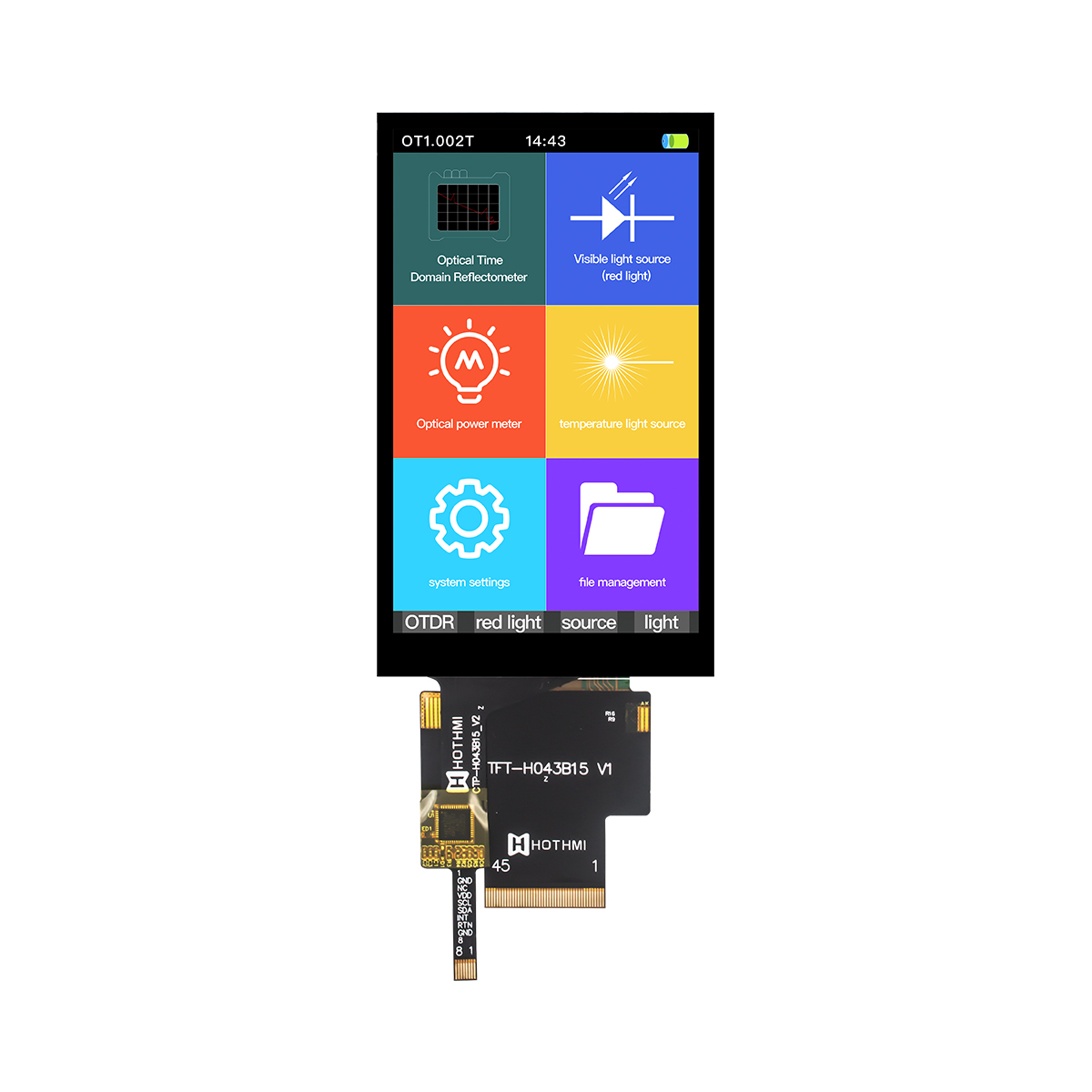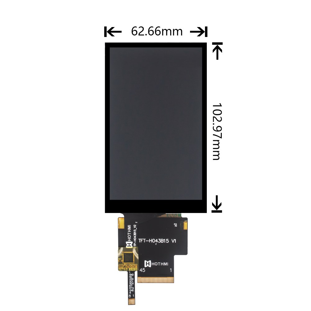 TFT-H043B15WVIST3C45这是一款4.3寸的全视角显示屏,分辨率为480x800,亮度适中,高清可见,这款型号带有电容式触摸功能,反应迅速。内置ST7701控制器,带有电容触摸功能,电容触摸是由GT911控制的。画质高,宽视角,支持RGB +9b_3SPI(fall)/16b_3SPI(rise)接口,FPC连接(可选连接器),2.8V电压,支持垂直显示。 所有材料均符合环保要求和 RoHS 标准。 该模块广泛应用于各种仪器仪表、智能设备等,适用于8051 PIC、AVR、ARDUINO、ARM、Raspberry Pi等单片机开发平台。