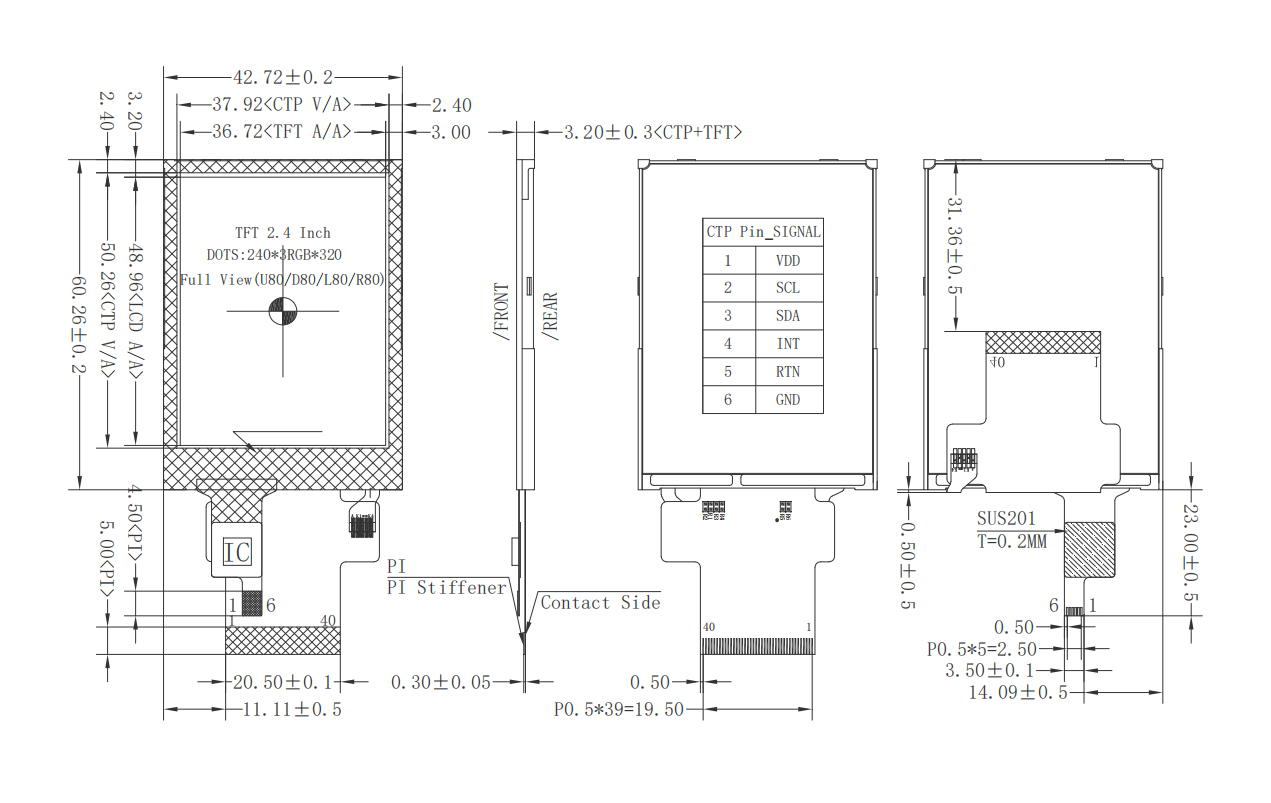 42.72x60.26x3.20 | 2.4 | 2.4 | 36.72x48.96 | 全视角 | 1500cd/m2 | 40PIN | MCU | 带CTP电容触摸芯片FT6236U | -30~80℃ | 3.3V | ST7789V | |